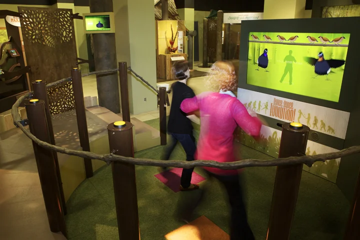 A gesture-based game invites visitors to mimic the unique mating rituals of the western parotia.